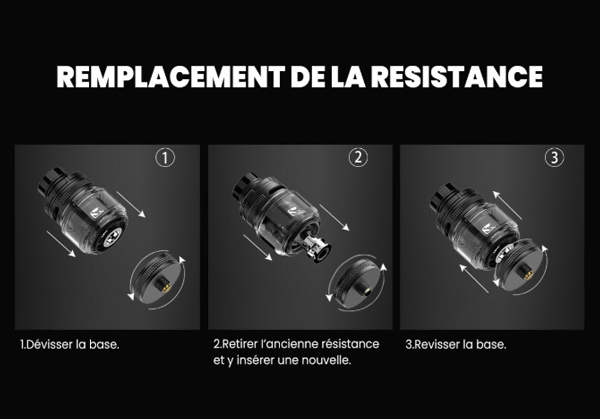 Amorcer la nouvelle résistance lors du premier remplissage, versez quelques gouttes de e-Liquide sur le coton, et aspirez plusieurs fois (par le drip tip). Vous pouvez fermer au maximum l'airflow réglable pour faciliter la montée du liquide dans les mèches.(n'ayant pas oublié d'avoir imbibé le coton du e-liquide)