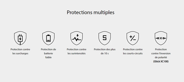 Enfin, plusieurs protections électroniques sont présentes, comme celle contre les courts-circuits, d'une protection contre la surcharge de la batterie, d'une protection contre les inhalations trop longues (supérieures à 10 secondes), et d'autres encore.