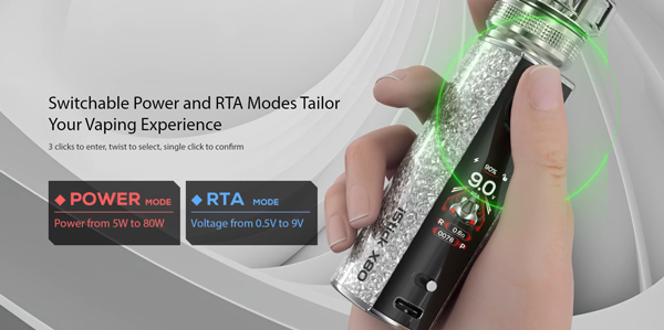 Deux modes d'utilisation vous sont proposés : Power traditionnel wattage réglable de 5w à 80w et RTA avec voltage réglable de 0.5V à 9V.