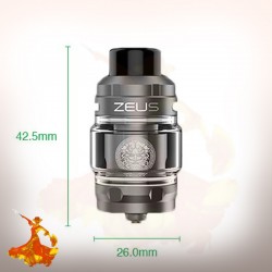 Le Clearomiseur Zeus est l'aboutissement de la gamme ZEUS de Geek Vape, il est conçu en acier inoxydable de haute qualité et présente des dimensions de 25mm de diamètre à sa base, pour une hauteur de 42.5mm de hauteur sans drip tip.