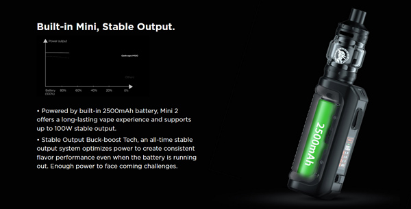 Alimenté par une batterie intégrée de 2500 mAh, le Mini 2 offre une expérience de vape longue durée et prend en charge une sortie stable jusqu’à 100 W.