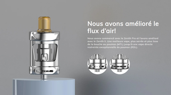 Simple à utiliser, le Zenith II d'Innokin permet aussi bien des inhalations directes que des inhalations indirectes, ce qui en fait un clearomiseur idéal pour tout vapoteur.