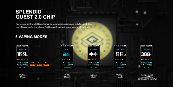 Même si ce dernier est moins performant que le DNA, il offre tout de même 5 modes de fonctionnement, des performances stables et puissantes pour une expérience de très grande qualité :
