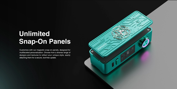 Les faces latérales arborent de magnifiques gravures représentant un centaure sur fond de figures géométriques, et Lost Vape a pris soin de faire de ces faces des panneaux interchangeables.