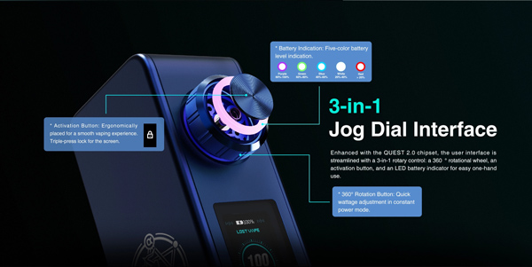 Lost Vape a positionné une molette en haut de la face avant, un bouton et un anneau lumineux se mêlent à elle, et le tout permet 4 fonctionnalités :