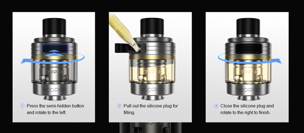 Construite en PCTG, ce réservoir vous offrira une contenance confortable 5,5 ml de e-liquide, et le remplissage se fera très instinctivement par le côté en ouvrant le bouchon en silicone prévu à cet effet sans ôter la cartouche !